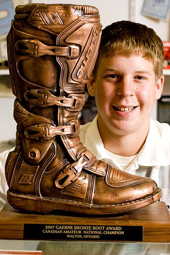 When I was six years old, I won the four-to-six 50 CC class at the Canadian national championships. I went to Loretta Lynn’s (US championships), which is the biggest amateur national championship in the world, when I was nine years old riding 50s; I’ve tried to qualify for Loretta Lynn’s a few more times. At Walton (the Canadian championships), I should have won the 50 CC seven-to-eight class in 2002, but I broke my femur. In 2005, I got a third place in the seven-to-12 class. This year, in one week, I won three classes, becoming Canadian champion for all three. Plus I won the Bronze Boot, which is for the most accumulated points throughout the whole week. That’s the biggest award you can win there.